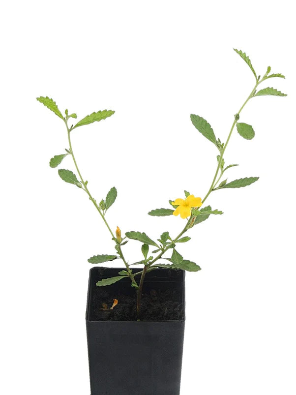 A small shrub between 30 - 50cm high with small yellow flowers and small narrow leaves with serrated edges. Native to mexico Damiana likes a well drained sunny position and is happy in a rocky garden. It is an aromatic plant and was popular with the Mayans as an aphrodisiac.